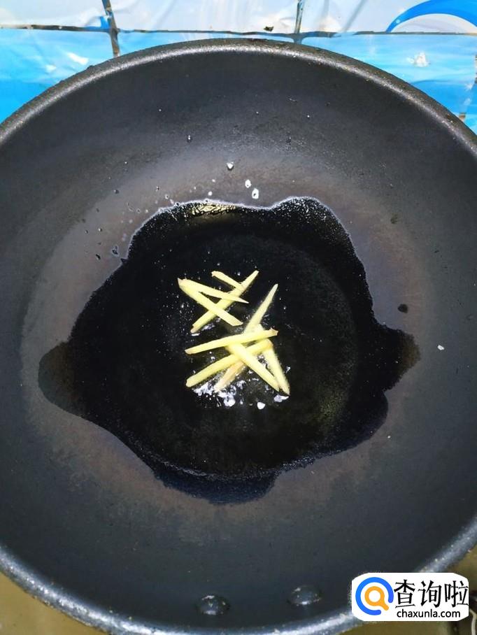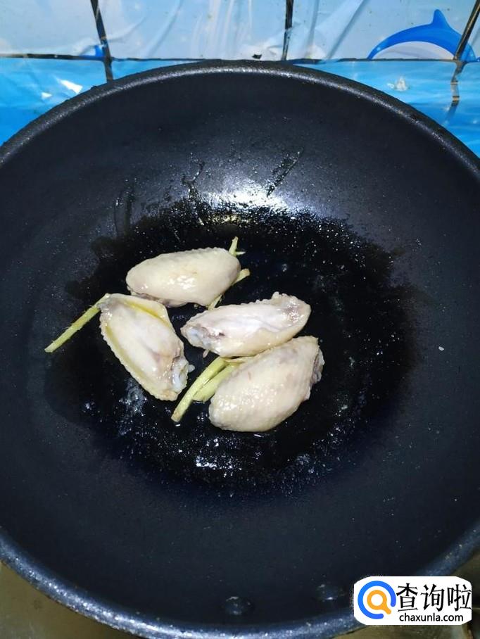 准备适量姜,切成丝,备用,炒锅中放入适量油,油热后,将姜丝放入锅中炒香,然后将鸡翅放入锅中,煎至表面微黄。