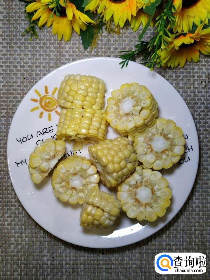 准备适量嫩玉米,剥去外皮,洗净后,切成小块,放入盘中备用。