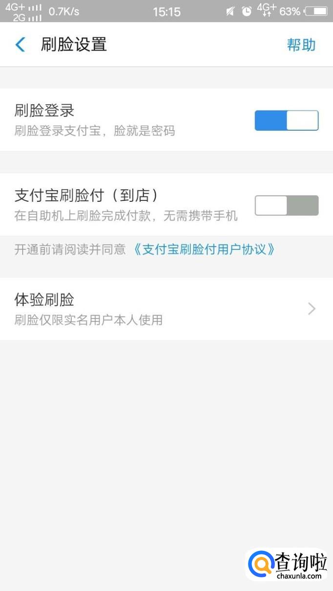 最后点击刷脸设置,并且将支付宝刷脸付点击开启即可。