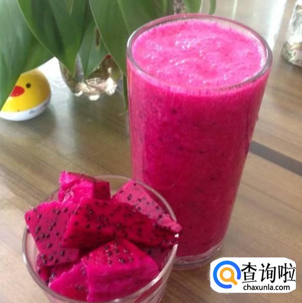 红心火龙果的果皮含有大量天然花青素,所以我们去皮时把贴着皮的那部分用勺子都刮下来,中间部分切块或用勺挖都可以,放入榨汁机,榨好后根据自己口味加入、蜂蜜或牛奶。