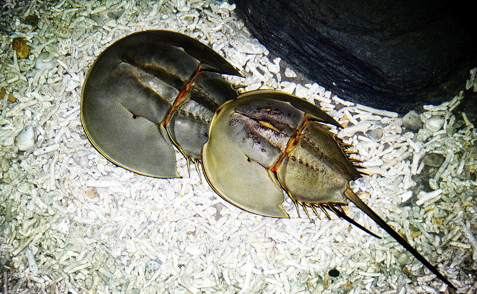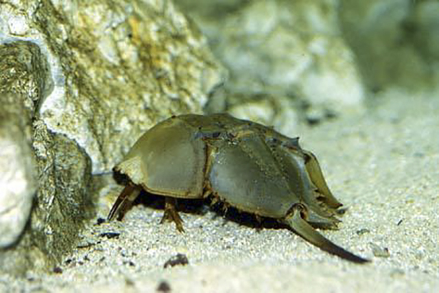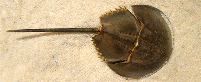 鲎,属于肢口纲(Merostomata)剑尾目(Xiphosura)的海生节肢动物,鲎形似蟹,身体呈青褐色或暗褐色,包被硬质甲壳,有四只眼睛,其中两只是复眼 ,头胸甲前端有0.5毫米的两只小眼睛,对紫外光最敏感,只用来感知亮度,头胸甲两侧有一对大复眼。虽然鲎可以背朝下拍动鳃片以推进身体游泳,但通常将身体弯成弓形,钻入泥中,然后用尾剑和最後一对步足推动身体前进。