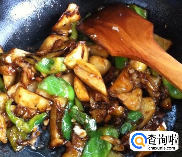 把炸制后的色拉油倒出,锅内留少量底油,然后放入炸好的土豆块和茄块,再放入辣椒块一起炒制。