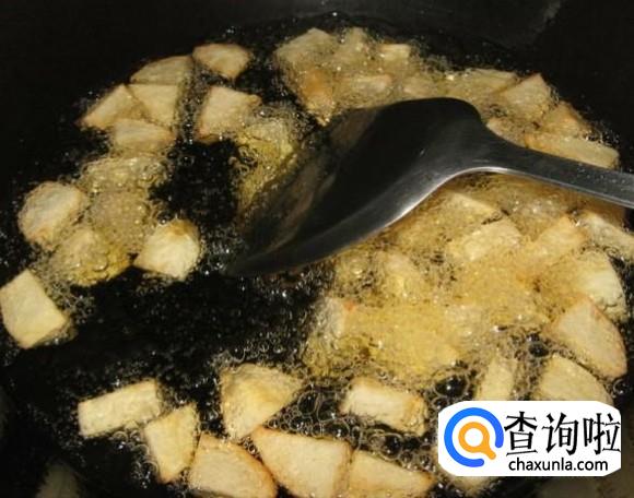 锅内放入色拉油,油温8成热时(将一根干爽的筷子放入油锅内,冒泡的话证明油温就可以了)放入土豆炸制熟透后捞出沥油;然后茄块也同样炸熟沥油。