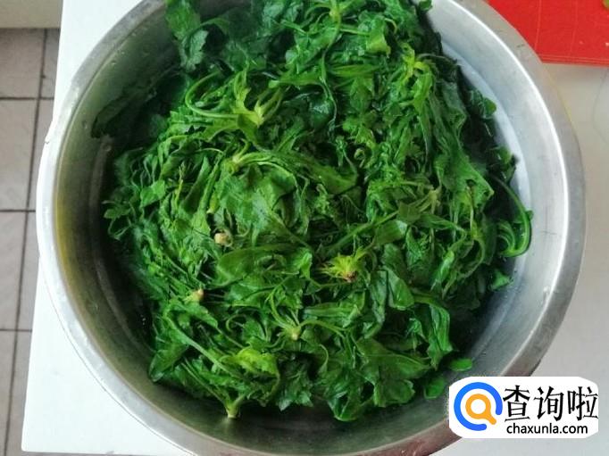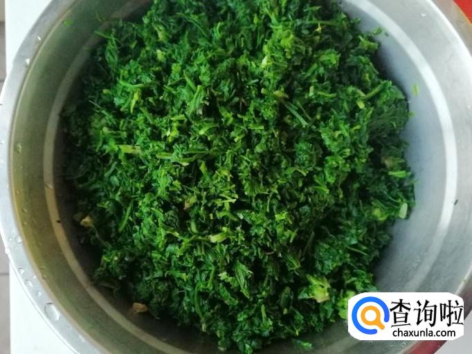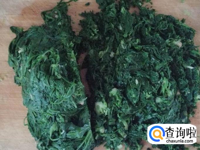 荠菜不用烫很久,煮开就可以,捞出荠菜过水,用手把荠菜水挤干,放在菜板上剁碎,放入容器待用。