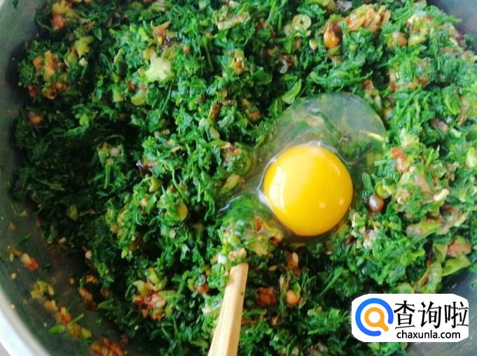 因为荠菜比较干,做馅不大容易出水,这时候可以放入一个鸡蛋,饺子馅会变松软些,要不包出的饺子吃起来很干,加鸡蛋后把馅搅匀待用。