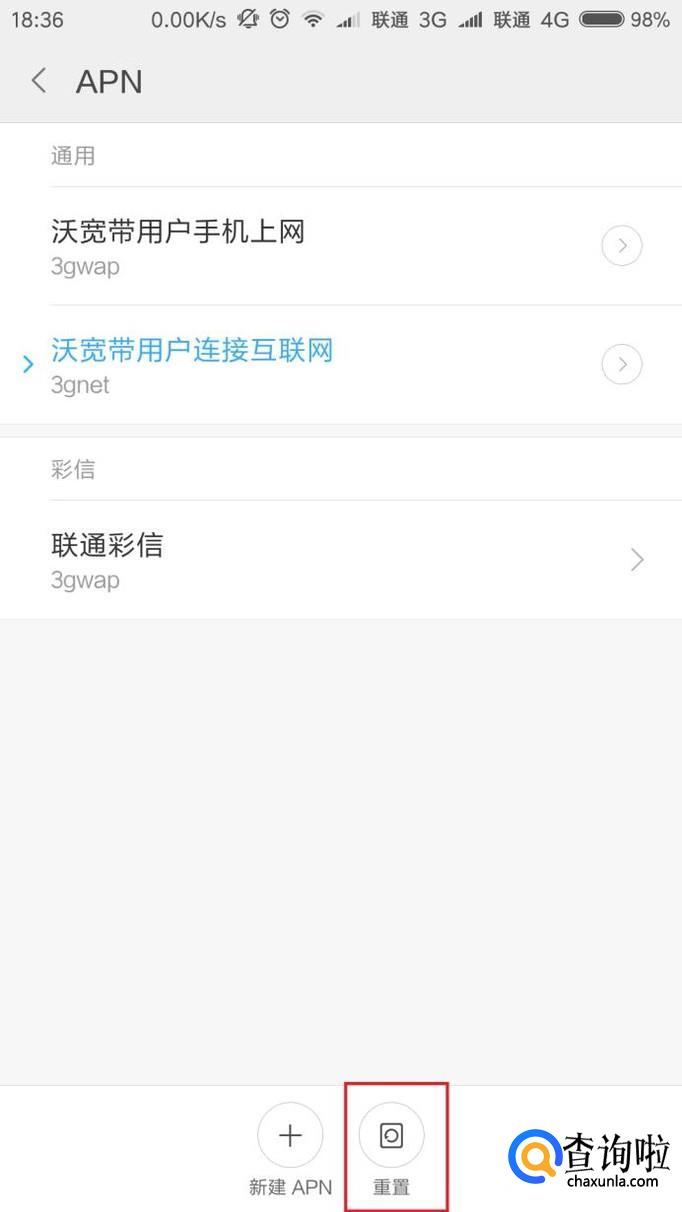 接下来,点击页面底部“重置”按钮,即可重置手机数据网络接入点配置。