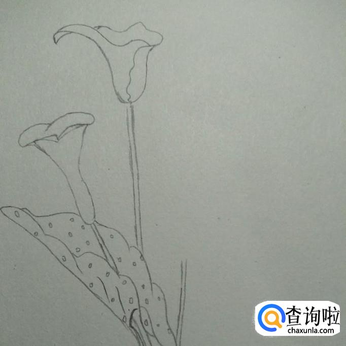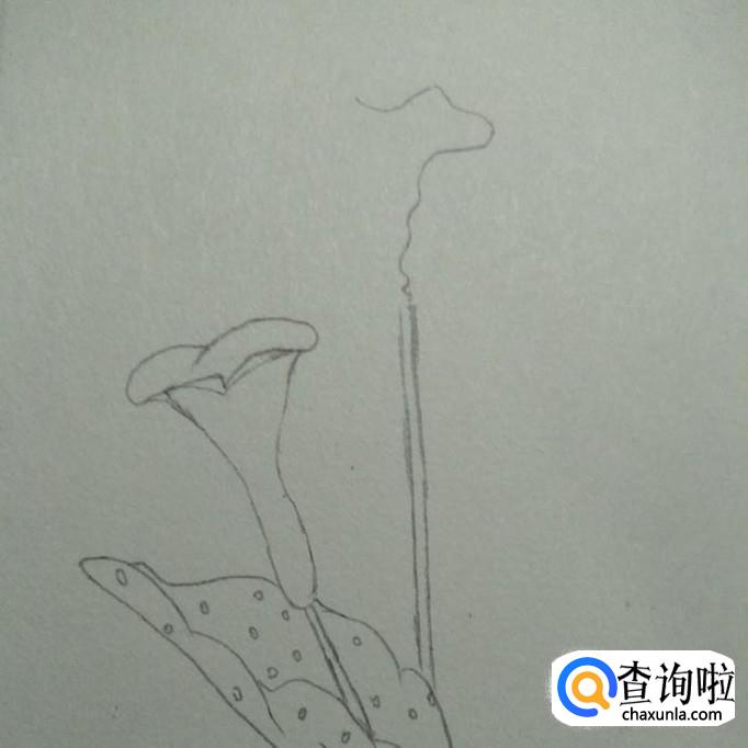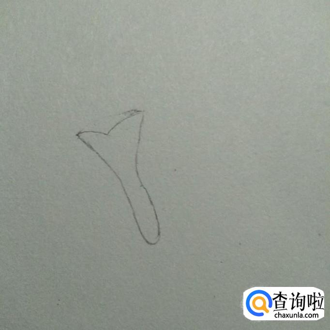 首先,我们在素描本上画出一个近似于喇叭形状的花形,其口向上,头部较宽,底部较窄,接下来,我们画一个尖端向下,两边向外凹的弧线,如下图2