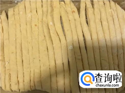 做地瓜面条。在砧板上撒上一些面粉,然后将面条放到上面,接着用擀面杖把面团擀开来,如果面团很大的话,要先分成几块,这样才能更好擀面。将面弄开后,直接用刀切成条状,如图所示即可。