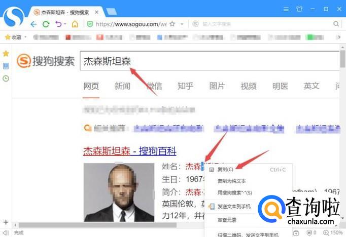 打开搜狗高速浏览器,然后在搜索引擎中输入一个外国人名字,之后按回车键,然后就可以在外国人名字中看到“·”了,我们选中,然后右击选择复制;