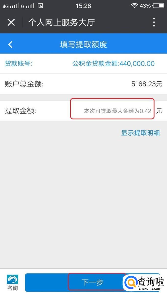 用户名和密码登录后,就可以看到自己的提取额度了,我本月已经提取完了,所以显示没有提取额度,您要办理提取的话,只需输入提取金额,然后点击下一步就行,手机会收到一个验证码,验证之后就可以了,一般转天就能到账。