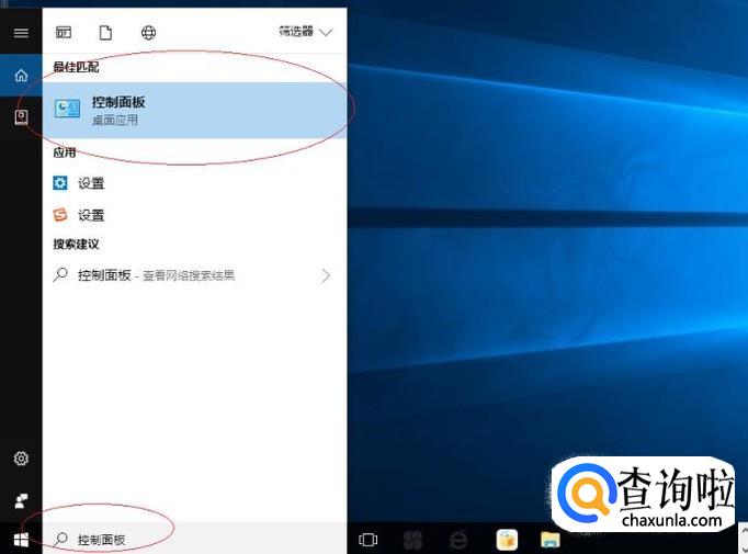 如图所示,搜索框输入"控制面板"。Cortana(小娜)显示搜索结果,点击"最佳匹配→控制面板"项。