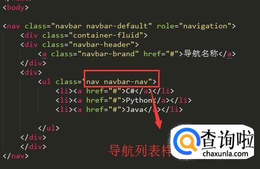然后我们在body标签中写下nav元素,如下图所示,注意给nav元素添加导航条样式
