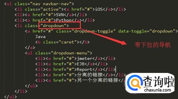 Bootstrap中的导航有下拉效果的设计,如果想用这种效果,需要用dropdown样式,如下图所示