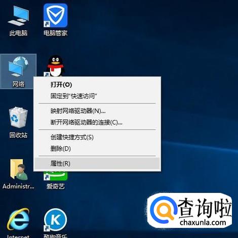 在桌面的“网络”图标上右键单击,在弹出的菜单里点“属性”。