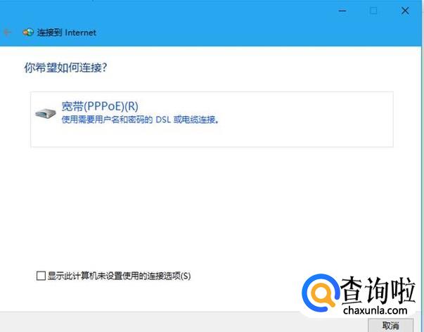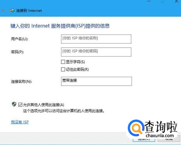 在“宽带(PPPOE)”的框框上点一下,在出现的界面里,上面的内容都可以不填,如果允许别人使用宽带连接连接网络,就在下面的“允许其他人使用此连接”前打钩,再点下面的“连接”。