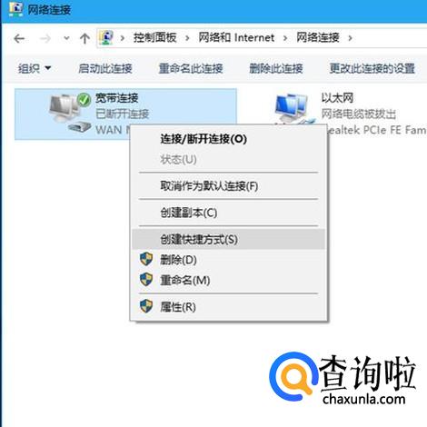 然后回到如图的界面,在左边点击“更改适配器设置”,就会在接下来的界面里看到“宽带连接”了,在上面右键单击,选择“创建快捷方式”。