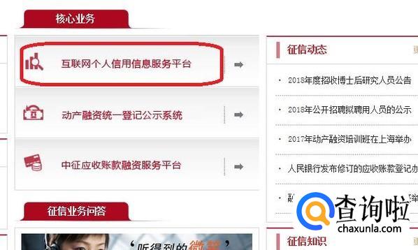 进入官网后,首页是没有注册的地方的,我们需要点击“核心业务”下面的“互联网个人信用信息服务平台”。