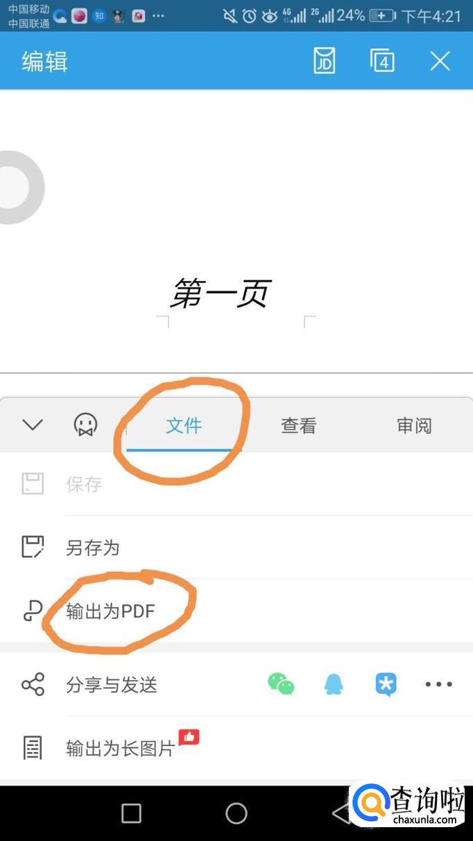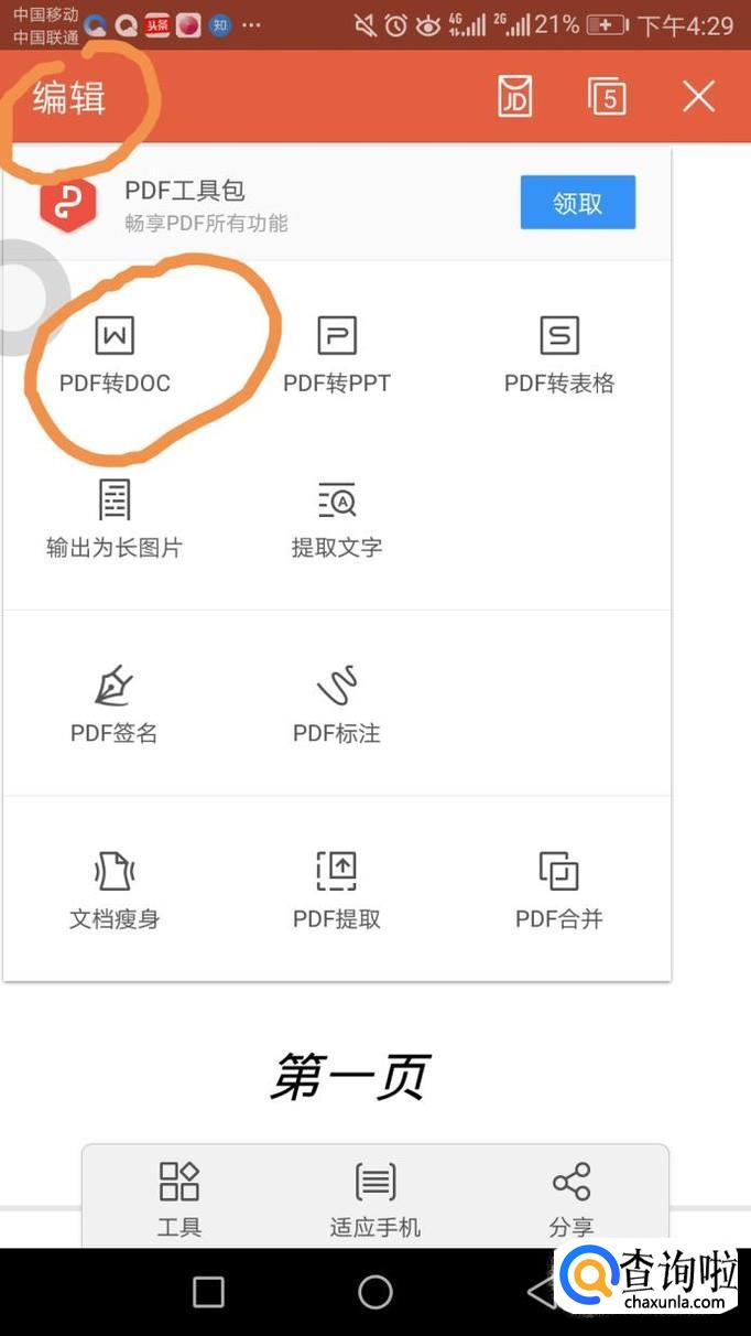 接着,点击该PDF文档,转入查看页面,点击左上方的编辑,选择将PDF转成doc。