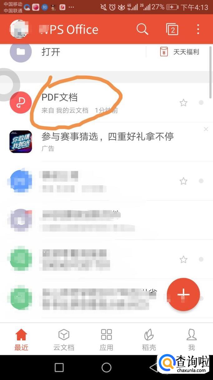 首先,打开手机中的WPS,选择自己想要PDF插入一页内容的文档。