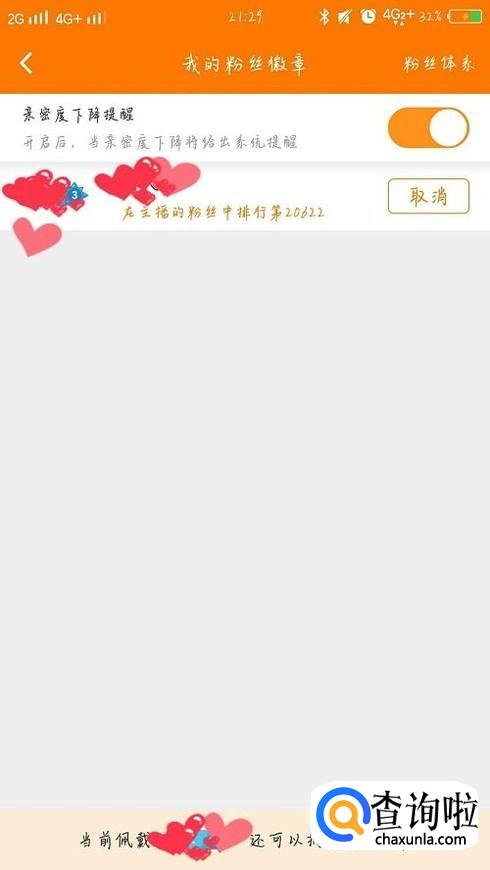 获得粉丝徽章之后,点击礼物的图标,在背包中会有免费的荧光棒,为主播送上荧光棒就可以增加亲密度,和粉丝徽章的等级,徽章的等级越高,荧光棒越多哦。送礼物也可以增加等级和亲密度哦。
