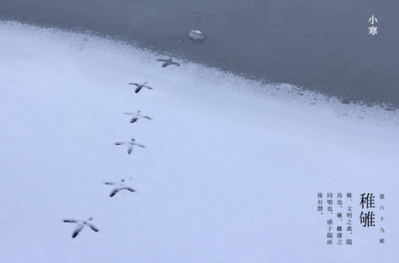 小寒的意思是天气已经很冷,我国大部分地区小寒和大寒期间一般都是最冷的时间段,“小寒”一过,就进入“出门冰上走”的三九天了。我国古代把小寒分为三候:“一候雁北乡,二候鹊始巢,三候雉始鸲”,古人认为候鸟中大雁是顺阴阳而迁移的,这个时候阳气已动,所以大雁开始向北迁移; 此时北方到处都能够看到喜鹊,并且能够感觉到阳气而开始筑巢;第三候“雉鸲”的“鸲”为鸣叫的意思,雉在接近四九时会感阳气的生长而鸣叫。