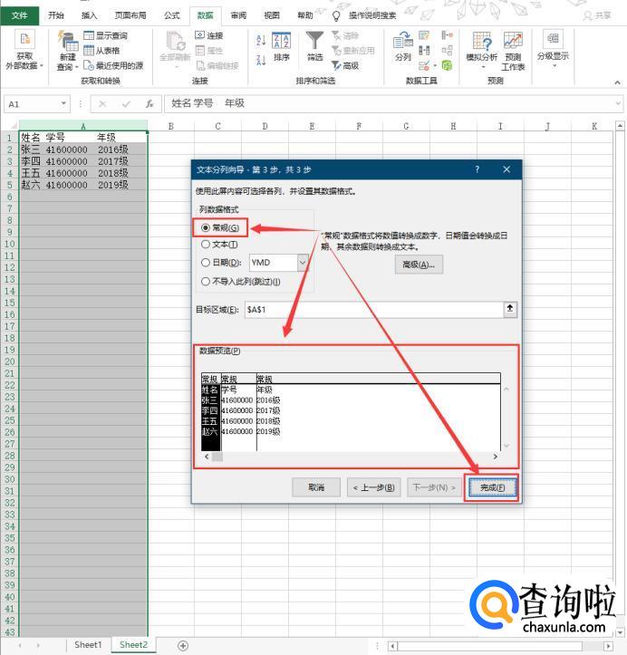 分列符号选取好后点击下一步,我们就可以选择数据类型,一般我们默认常规就可以的,下方数据预览可以查看我们拆分数据后的格式,最后点击完成,