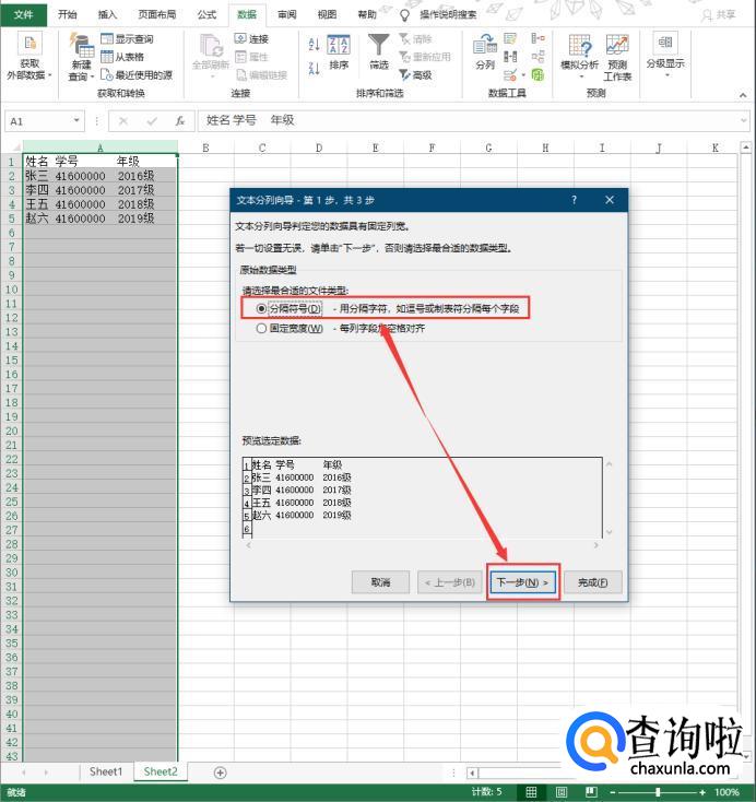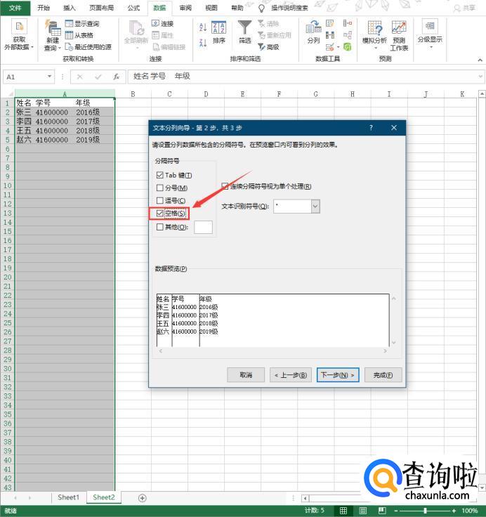 然后根据自己的需要选取不同的分隔符号进行数据的分隔,小编这里演示的是用空格隔开的数据,所以勾选的是空格,如果小伙伴们是其他符号可以根据实际情况选取合适的分隔符号