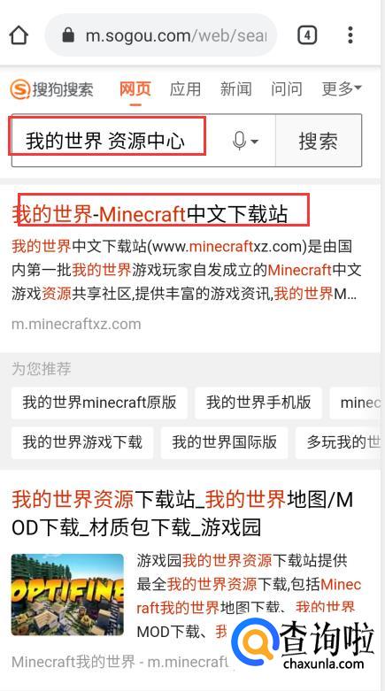 在手机上利用搜索输入我的世界 资源中心查找,点击第一个进入。