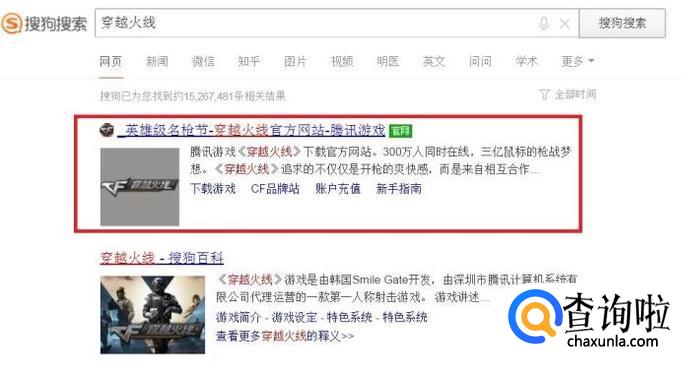 首先,使用搜狗搜索“穿越火线”关键字,在搜索结果页面中,点击进入穿越火线官网页面。