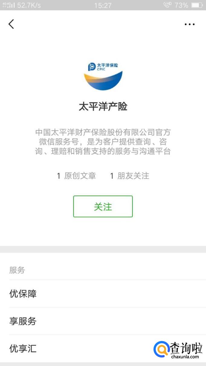 打开微信,搜索“太平洋产险”并关注其公众号。