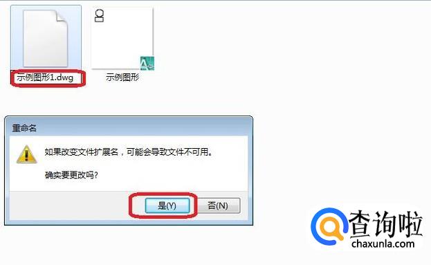 为了避免和原图形文件重名,我们把它命名为“示例图形1”,后缀名改成“.dwg”,如图所示,然后在是否要更改的提示框中选择“是”。