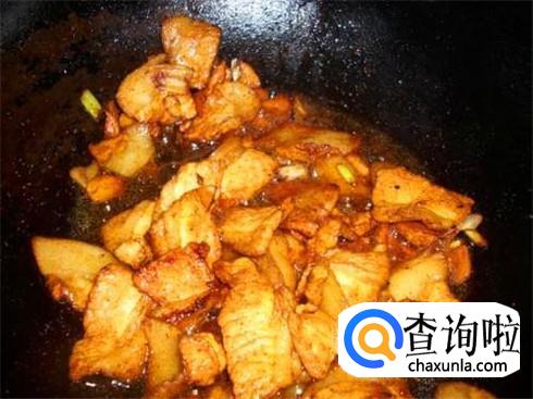锅里放油烧热,用葱姜爆香之后放进去肉片翻炒,直到肉片变色的时候加上一勺子生抽翻炒。