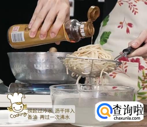 将煮好的面条捞起来过冷水,沥干水份拌入香油,然后再过一次沸水。