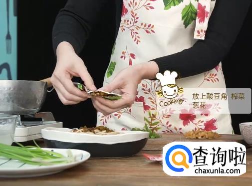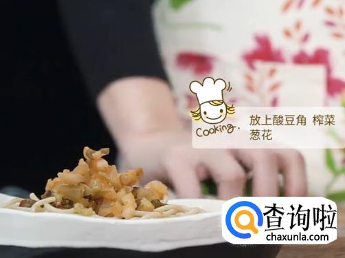 放上酸豆角,榨菜,葱花搅拌均匀。