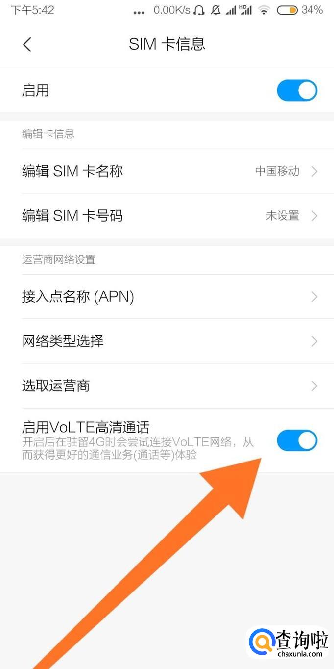 接下来关闭“启用VoLTE高清通话”选项后,手机状态栏顶部的HD字样就会消失。