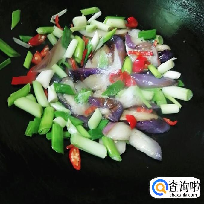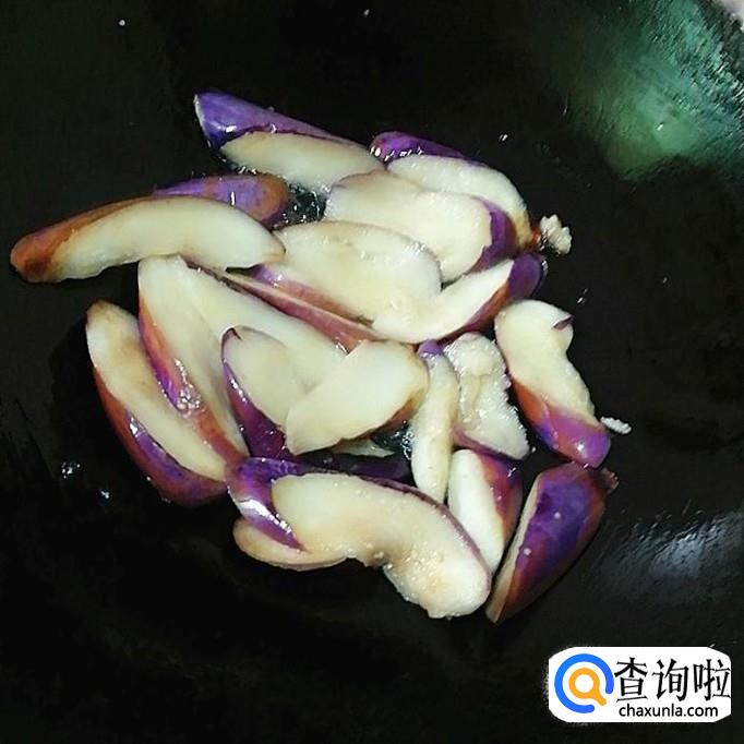 锅烧七成热放适量花生油,把茄子放下去,中火煎炒,腌过的茄子不耗油,而且容易熟,看到茄子皮起皱,茄子肉软了就熟了。