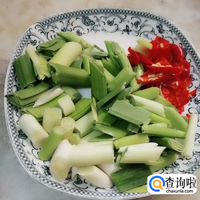 把青蒜苗切掉根,摘掉死叶子再清洗干净后切段备用。小米辣洗一下切碎,生姜去皮切成丝。