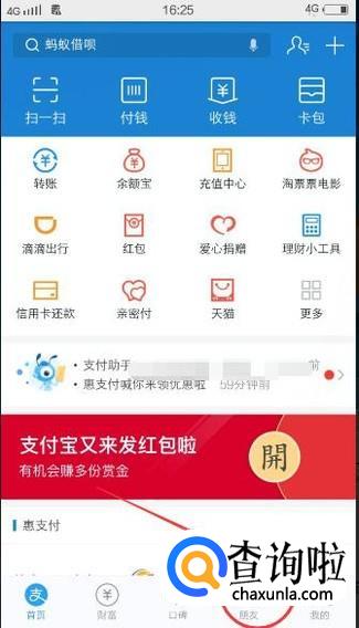 打开支付宝,然后点击下方的【朋友】选项卡,如下图所示:
