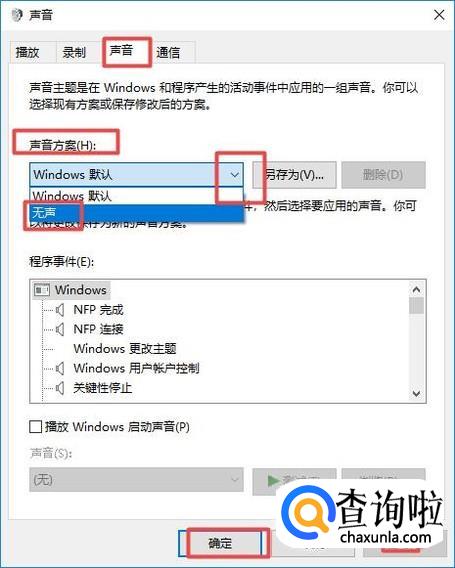 弹出的界面,我们点击声音,然后我们点击声音方案中的下拉箭头,弹出的界面,我们点击无声,之后我们点击应用,然后我们点击确定就可以了。