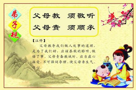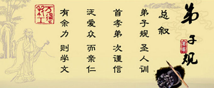 《弟子规》原名《训蒙文》,一共分为五个部分,即弟子在家、出外、待人、接物与学习上应该恪守的守则和规范。“弟子”的意思比较多,具体说来,在家指孩子,在学校指学生,在社会上指公民。“规”就是规范。“弟子规”的意思就是“弟子”们应该遵守的社会道德规范。它是传统道德教育著作的纲领性书目。