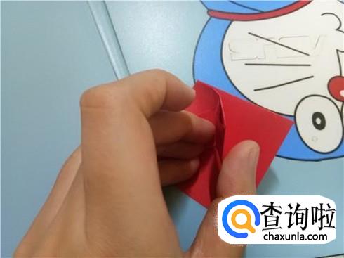 最后将手指从下方的开口处伸入,并且将它四边的都给轻轻的扯开进行整理,粘上我们之前做好的帽子标识,这样一个超级玛丽的帽子就折好了。