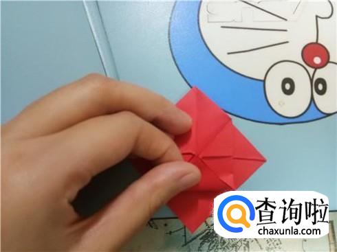 我们将右边的未折叠过的部分轻轻的向左边翻转过来,下边的部分也是如此。再将两边的角沿着中间的这条线给对折过来,将下边突出的小三角形给折叠上去,再将下边的这部分给翻转上去。