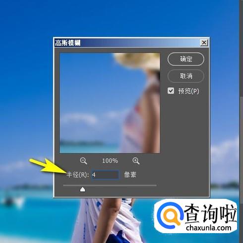 调出高斯模糊面板,设置半径值为4;再点确定。那么,相片背景就有了虚化效果啦。