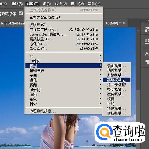 鼠标点菜单栏中的“滤镜”;弹出下拉菜单再点模糊,再点:高斯模糊。