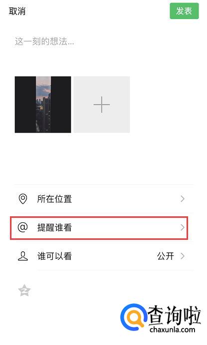 @好友的功能只存在于发送朋友圈的时候,在发送页面下方有一个功能【@提醒谁看】,我们点击一下。