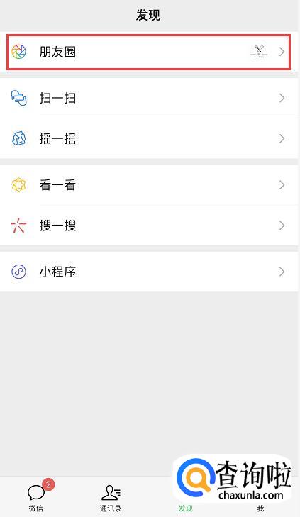 进入发现列表页后,有朋友圈、扫一扫、摇一摇、小程序等功能,这里我们点击【朋友圈】。