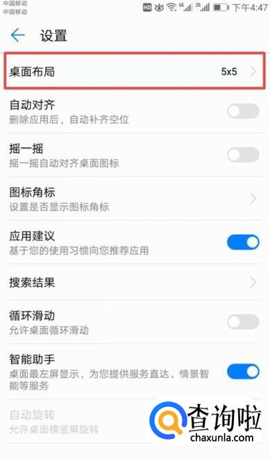 进入设置后,我们就可以看到很多的设置选项了,此处我们选择其中一个设置进行演示,我们点击桌面布局;