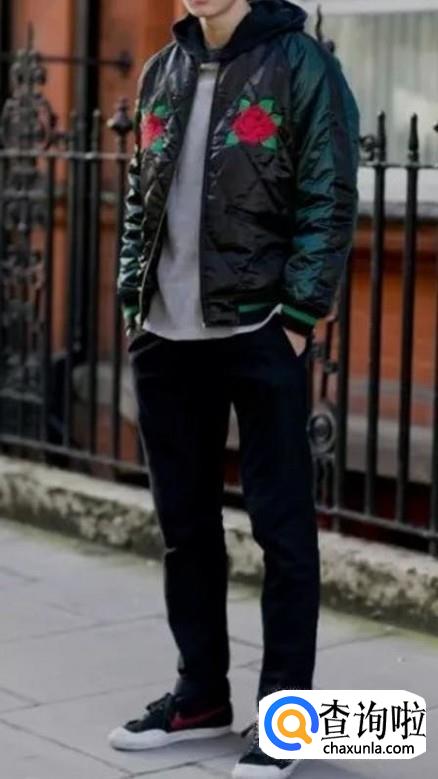 夹克这种衣服适合比较痞气的男孩子,里面搭配卫衣是不错的选择,裤子不要紧身裤,宽松一点的九分裤即可,鞋子最好是板鞋。