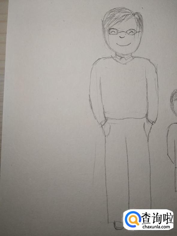 确定好比例,开始画爸爸。我们画一个戴眼镜穿毛衣微笑的爸爸。