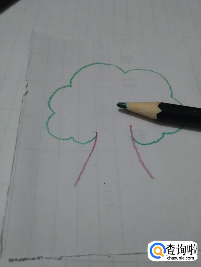 在树干上方,用绿色彩笔画一圈相连的弧线,表示苹果树的树冠。